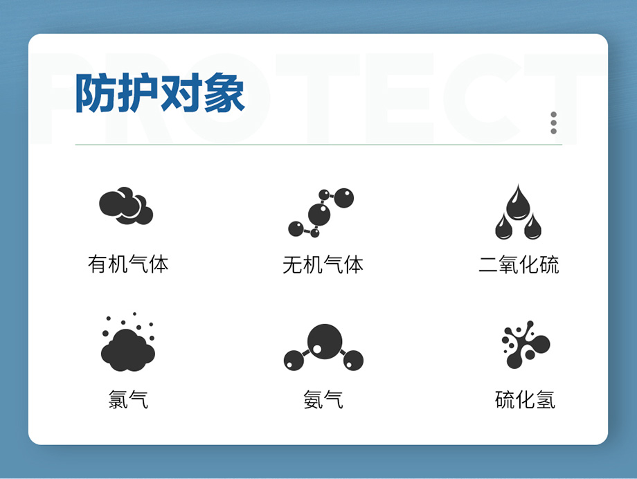 防護(hù)范圍:主要防護(hù)有機(jī)、無(wú)機(jī)、酸性氣體或蒸汽、氨及氨的有機(jī)衍生物及硫化氫氣體