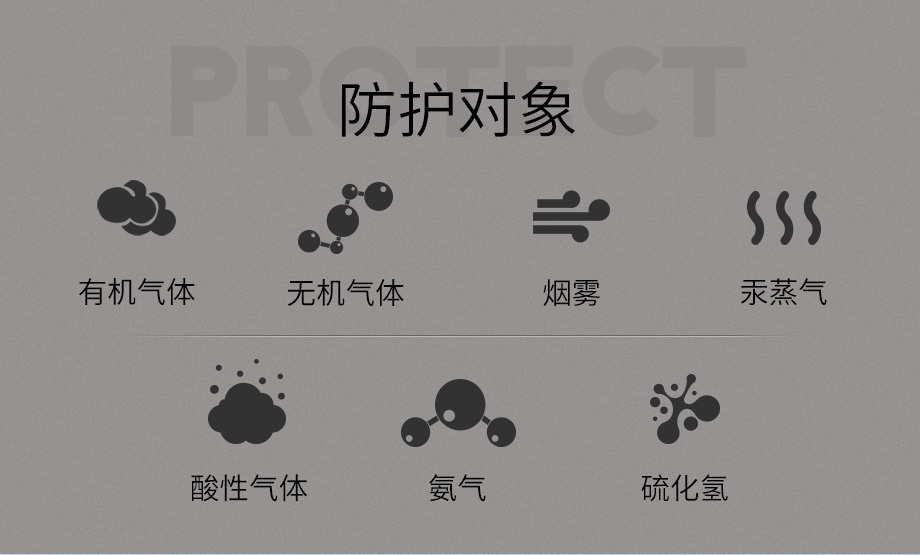 防護(hù)范圍:主要防護(hù)有機(jī)、無(wú)機(jī)氣體、酸性氣體、氨氣、硫化氫、汞蒸氣及煙霧